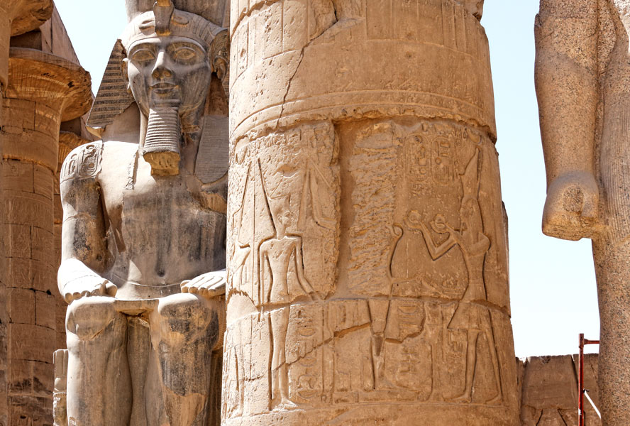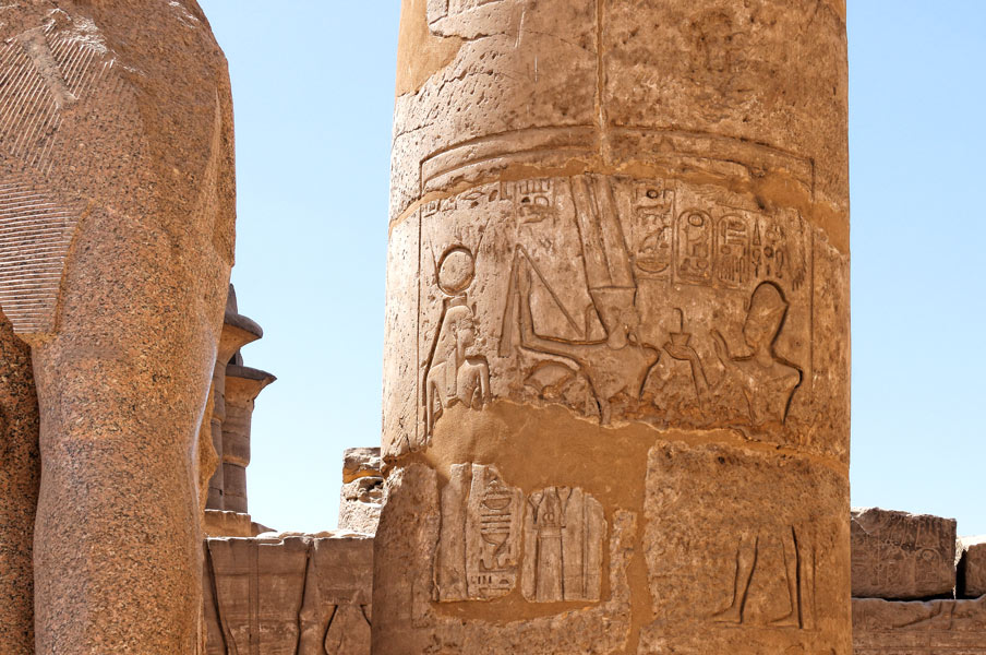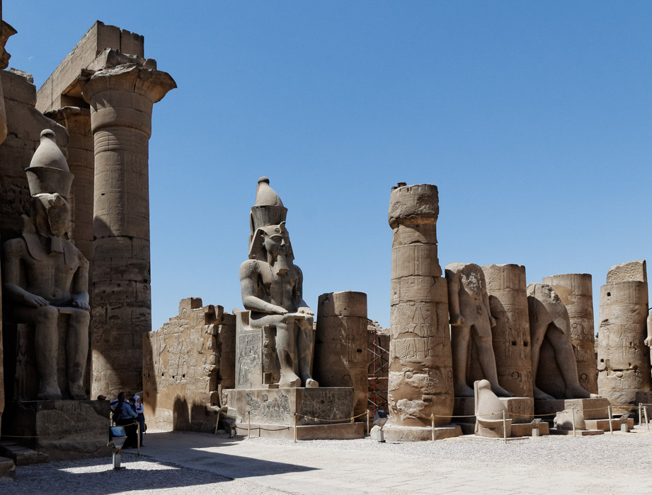 Cette vue montre la partie sud de ce côté de la cour : le colosse assis du côté est, le passage vers la grande colonnade, le colosse du côté Ouest, les restes des colonnes et des statues.