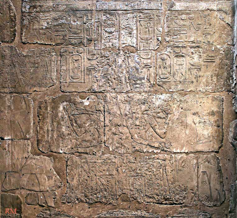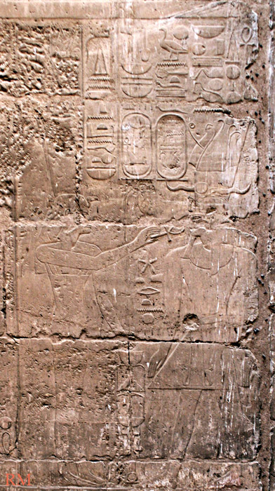 Double scène du haut : le roi reçoit un collier Menat de Mout assise.