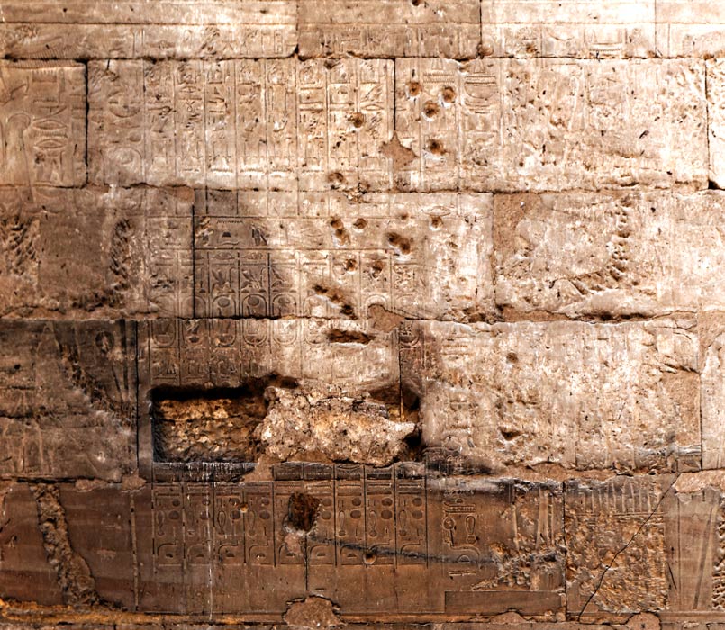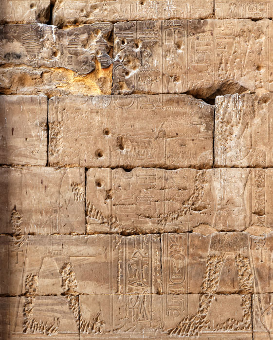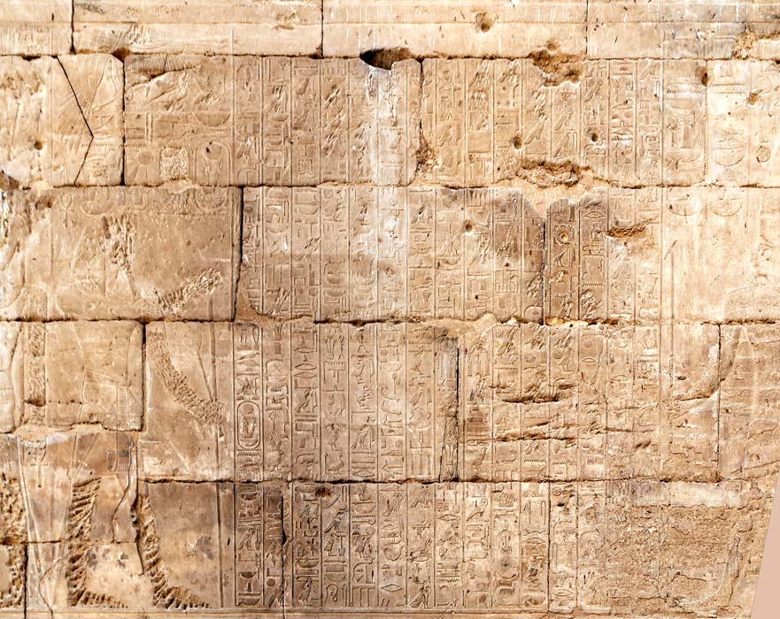 Le roi se tient devant Amon-Rê, 2 sceptres à la main. Entre les 2 personnages, un texte du rituel de fondation.