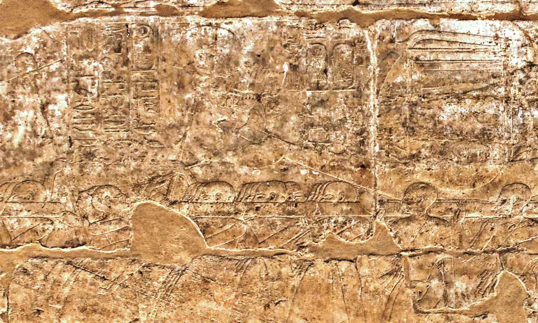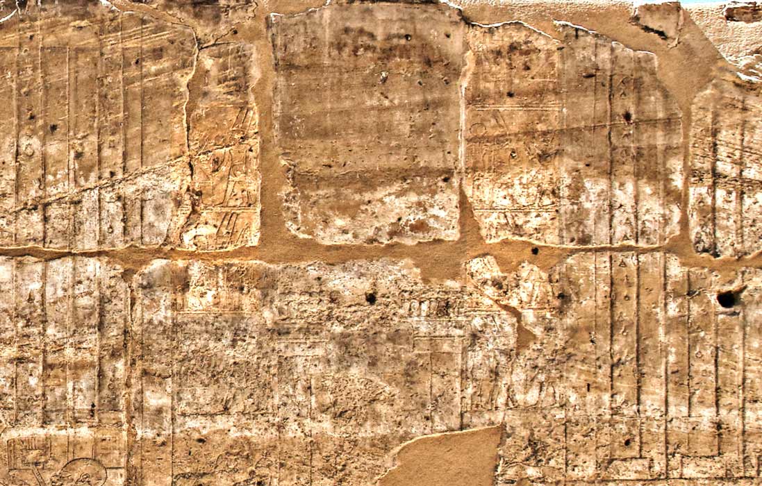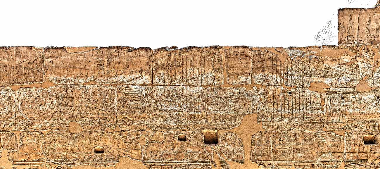 Cette scène faisait partie d'une grande scène reconstituée sur la planche 4 de l'oip 112. Le détail en est donné sur la planche 16. Les barques sortent de Karnak, portées par des prêtres. Le pylône de Karnak y est représenté avec sa porte et ses mats (les lignes verticales ci-dessus). Les grands pieds sont ceux du roi qui sui la grande barque d'Amon portée par des prùetres dont on voit les pieds devant lui. En dessous, la barque du roi est présédée par la barque de Mout.Au dessus, il reste encore les pieds des prêtres qui portent la grande barque d'Amon vers le Nil où elle sera transportée vers Louxor grace à une grande barque. En dessous, la barque de Khonsou est transportée par des prêtres, suivie de la barque de Mout