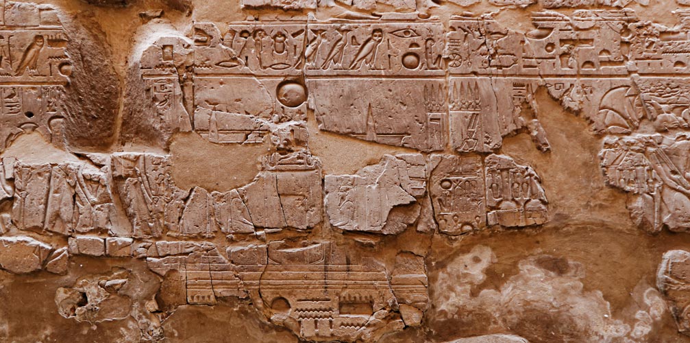 Sur le registre du bas des hommes portent des jarres de vins à gauche et des sacs de grains suspendus à des bâtons.