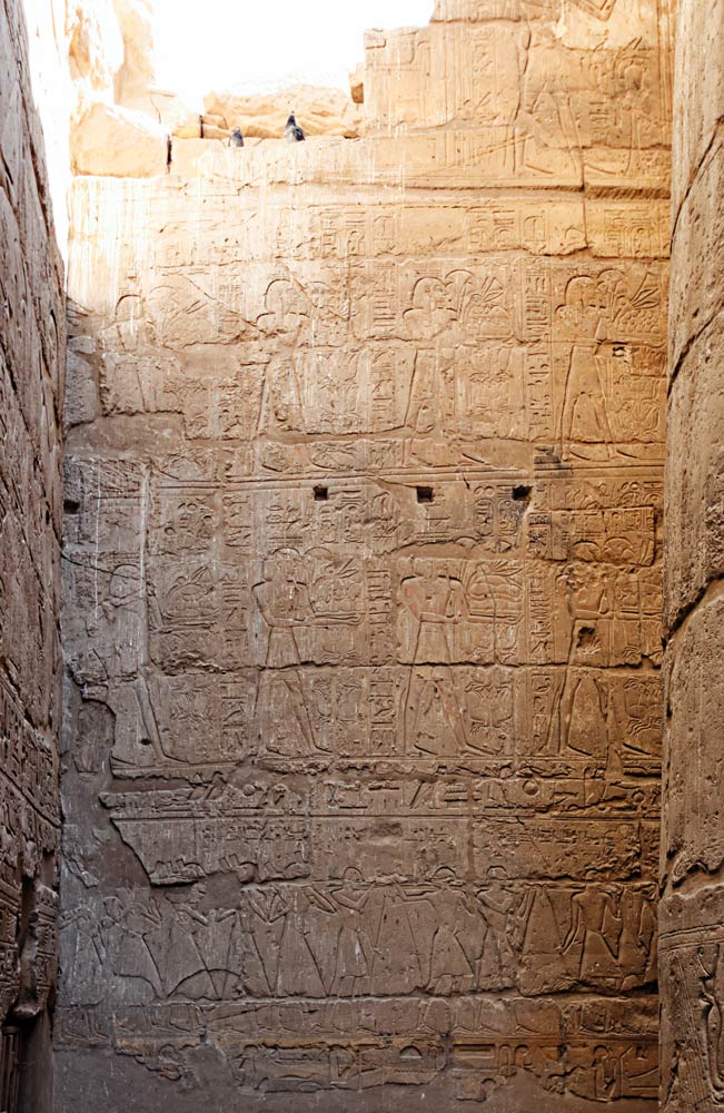 Sur le registre supérieur, 2 scènes d'offrandes. Les 2 registres médians montrent des porteurs d'offrandes.