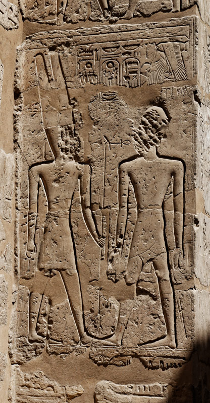 A gauche, en haut, le roi Ramsès II offre du lait à Amon-Rê qui lui promet l'éternité en tant que roi.