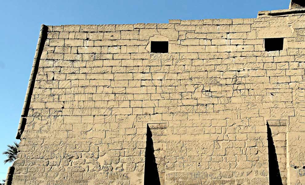 Le roi est sur son char, entouré d'ennemis et se dirige vers une ville entourée d'eau, Qadesh. En dessous de cette scène, sont gravés les textes racontant la bataille (d'après C. Obsomer).