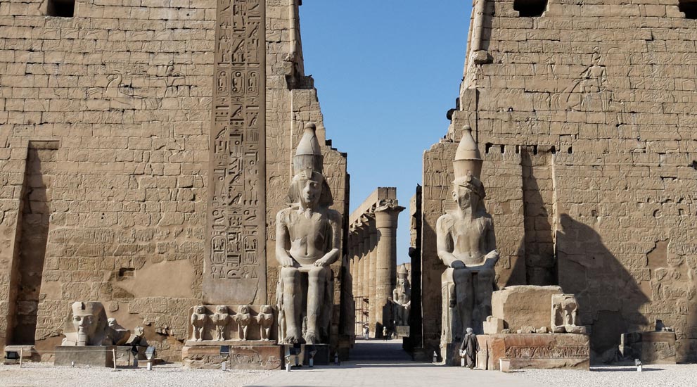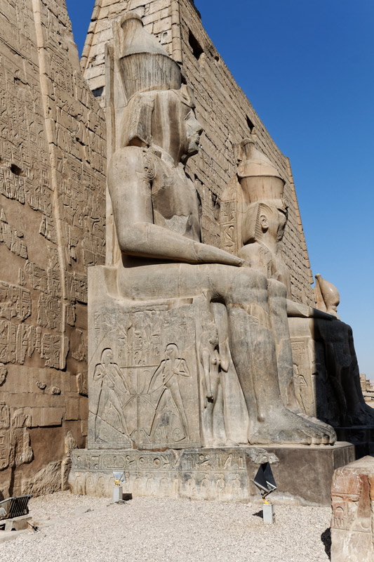 Les statues représentées sur les gravures du temple ne sont plus toutes en place. Restent principalement les 2 colosses assis. A l'Est, le colosse dénommé "Souverain des Deux-terres". L'autre n'a pas gardé la totalité de son nom.