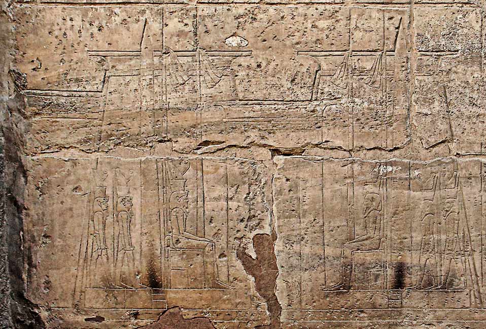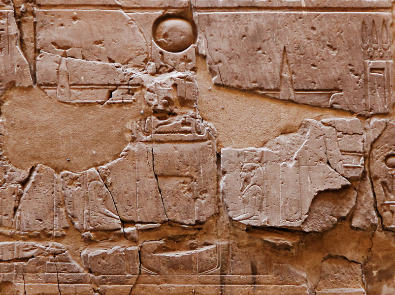 Cette représentation du temple est gravée sur l'arrière du pylône Est. Ce relief est accompagné d'une inscription qui date de l'an 3. Seuls les obélisques et 2 colosses assis étaient en place à ce moment-là. |