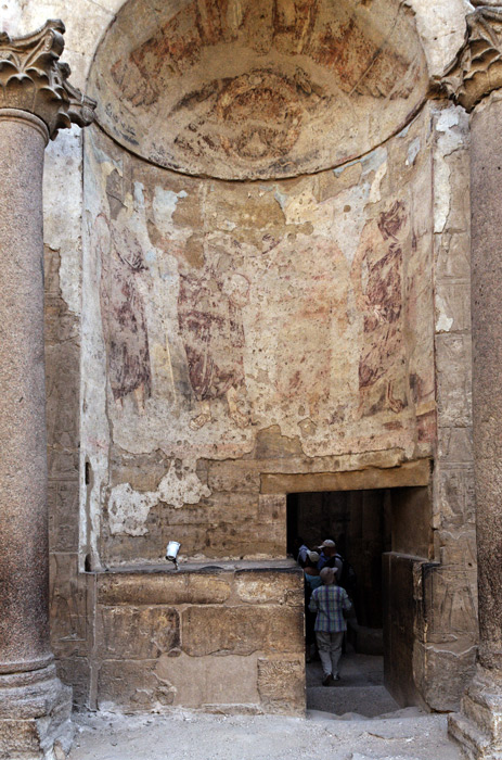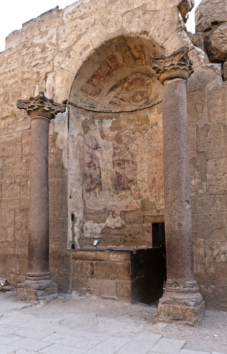 | L'abside a été construite à la place de la porte menant à la salle dite des Offrandes. les scènes de la porte sont à nouveau visibles après la dégradation de l'enduit romain (voir le lien Porte Sud). A l'époque romaine elle a été décorée de figures debout d'empereurs romains : Dioclétien, Maximilien et les deux Césars (Weeks, 2005), dont les silhouettes sont toujours visibles. C'est dans cette salle et devant ces figures que les sujets égyptiens, notamment les chrétiens devaient prêter allégeance à l'empereur romain. La porte actuelle a été percée en 1950. |