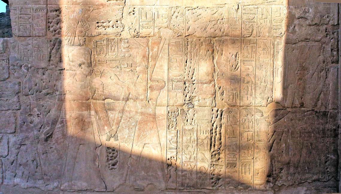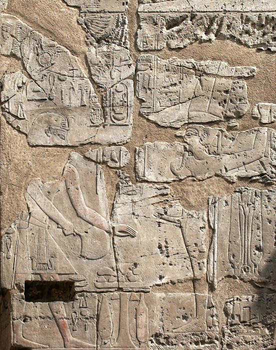 Le roi est conduit vers Amon par Horus (que vous pouvez deviner derrière lui) et Atoum devant lui. Atoum tend au roi le signe de vie. Devant eux, se dressent deux pavois, l'un portant le placenta royal et l'autre portant Oupouaout . Ces pavois sont représentés avec le roi depuis (au moins) la tête de massue de Scorpion II . On retrouve d'ailleurs une scène semblable dans ce qui était le temple
