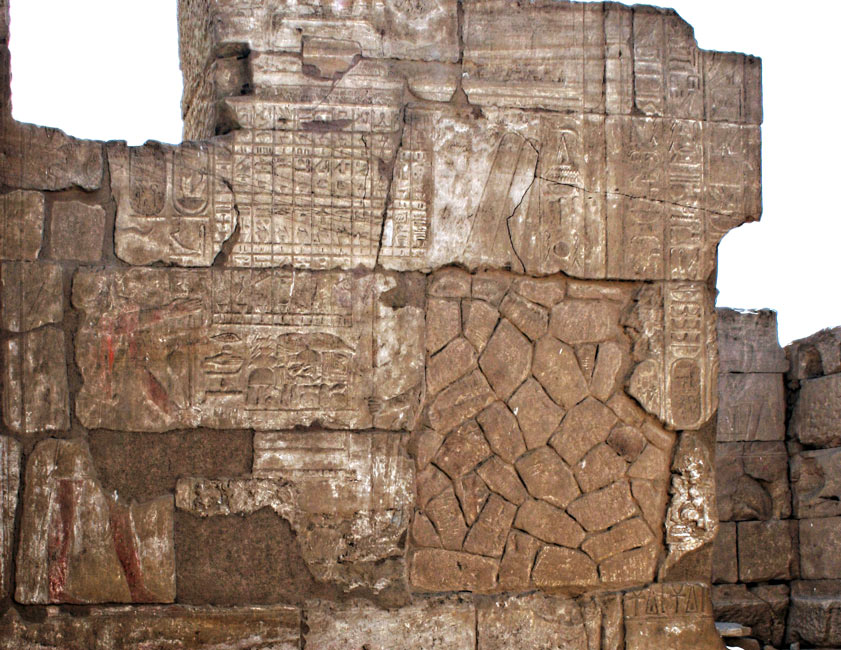 Ici le roi consacre des offrandes à Amon, avec une liste de ces offrandes. A droite, une partie des titulatures de la porte et une vue vers la salle XVI contiguë.