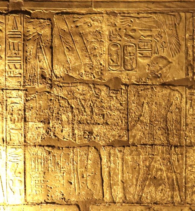 Première scène à côté de la paroi Ouest : le roi porte une coiffure composite. Il reçoit le signe de vie d'Amon-Rê. Le côté du dieu a été martelé.