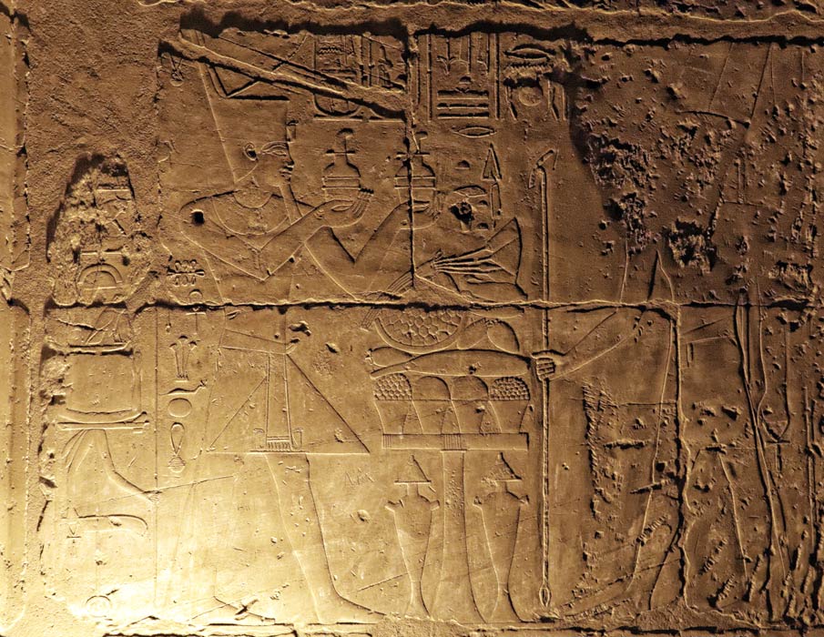 | Cette scène est située dans l'angle Nord de la salle. . Le roi Amenhotep III est suivi de son ka, représenté sous une forme abstraite, image malheureusement un peu abîmée. Le roi offre des récipients contenant du lait à Amon. Le nom du dieu a été, semble-t-il, martelé et la partie supérieure droite est manquante. |
