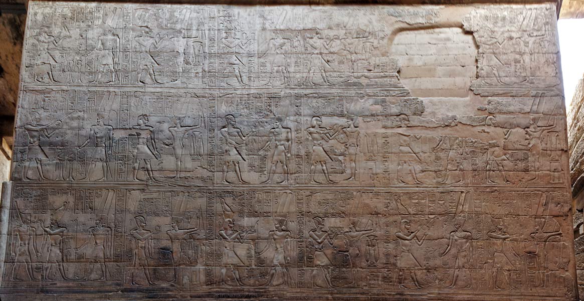 La paroi extérieure Ouest comporte 18 scènes d'offrandes organisées sur 3 registre de 6 scènes; une des scènes du registre du haut est complètement détruite. Ces scènes commencent par la scène en bas à gauche qui est une scène de Montée Royale. Ensuite le 'pharaon' Alexandre présente différentes offrandes à Amon-Rê représenté comme Kamoutef ithyphallique une fois sur deux. Ces scènes sont la continuation des scènes de la paroi extérieure Est.Le roi porte différentes couronnes. Cette vue de la paroi extérieure Ouest a été reconstituée à partir de plusieurs vues.