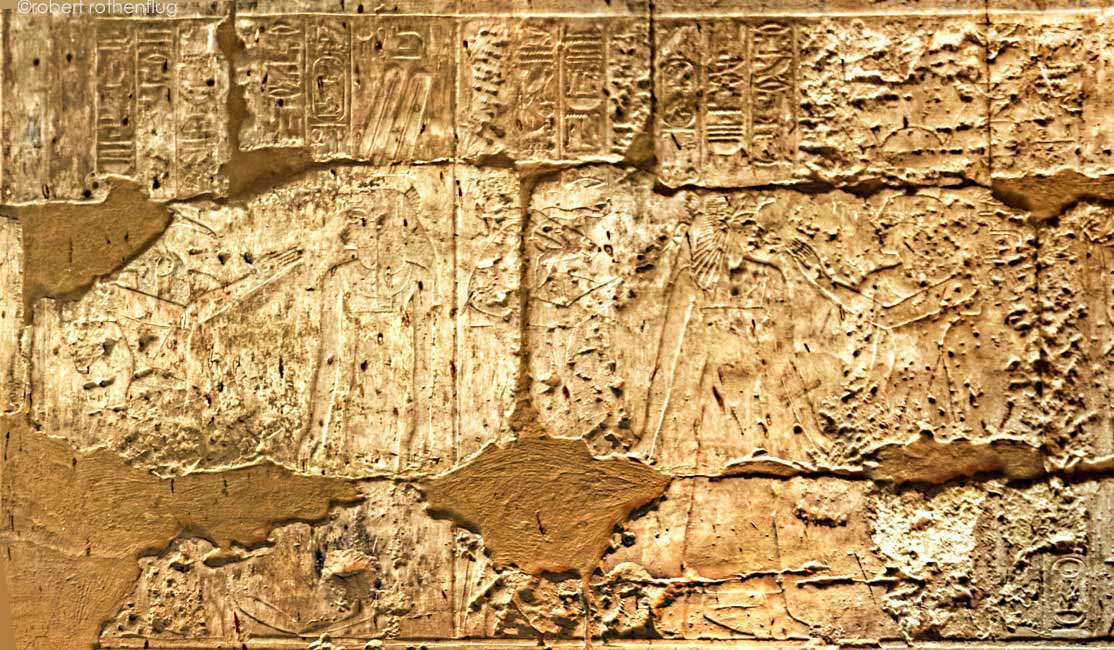 Dans la scène de gauche, le dieu Thot annonce la bonne nouvelle à la reine. A droite, Khnoum et une déesse (Hathor, Isis?)