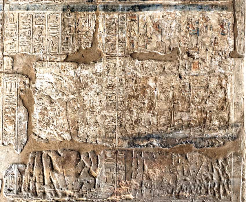 Amenhotep III est couronné par une déesse à tête de lionne devant Atoum.