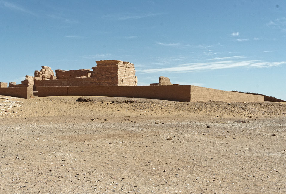 Le temple de Deir el-Haggar s'élève sur une petite colline. La vue ci-dessus montre l'enceinte en briques et derrière du temple. Le temple fut construit par des empereurs romains : commencé sous Néron ((54-68), il fut terminé par Domitien (81-96).L'enceinte en briques est assez bien conservée.Le temple est dédié à la Triade Thébaine.