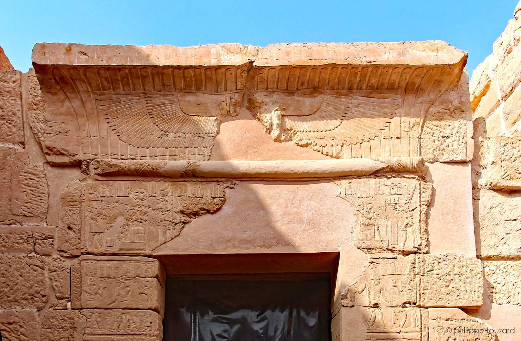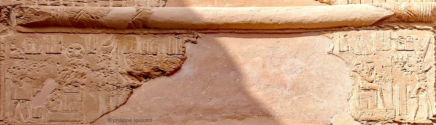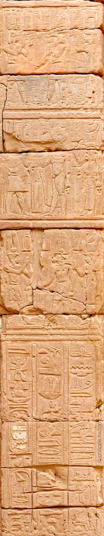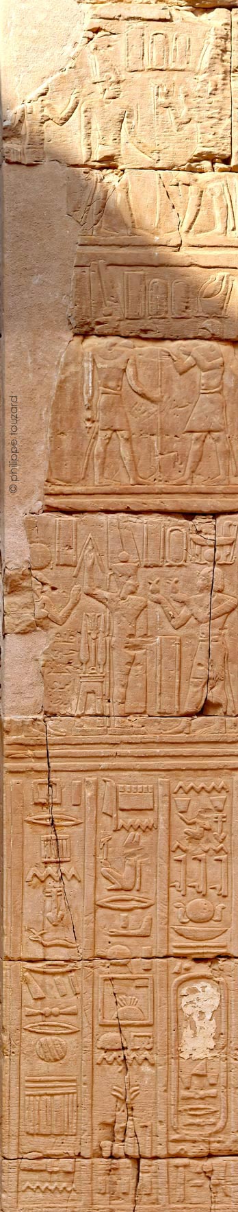 Sur toute les scènes de la porte, les cartouches et les emplacements d'inscriptions sont vides, sauf dans le texte du bas qui contient les cartouches de Domitien.