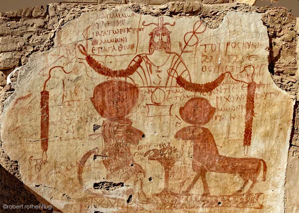 Comme le texte en grec associé le précise, le personnage barbu représente le dieu Sarapammon, association de Sérapis et d'Ammon. Le dieu Sérapis (ou Sarapis selon les auteurs) a été crée par les Lagides, probablement dès Ptolémée Ier. Divinité chtonienne, Sarapis possède la plupart des caractéristiques d'Osiris. Avec sa parèdre Isis et Harpocrate, il forme la Triade Isiaque. Il était vénéré surtout à Alexandrie.