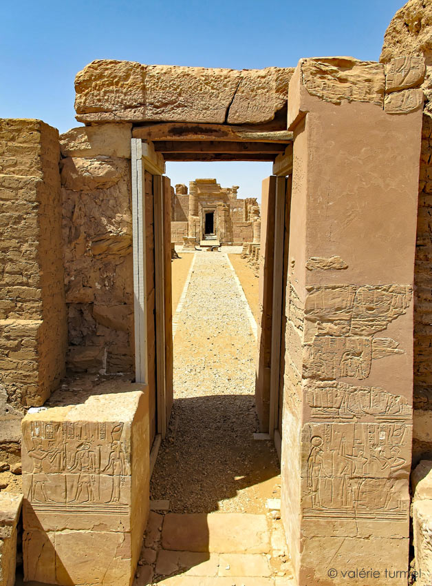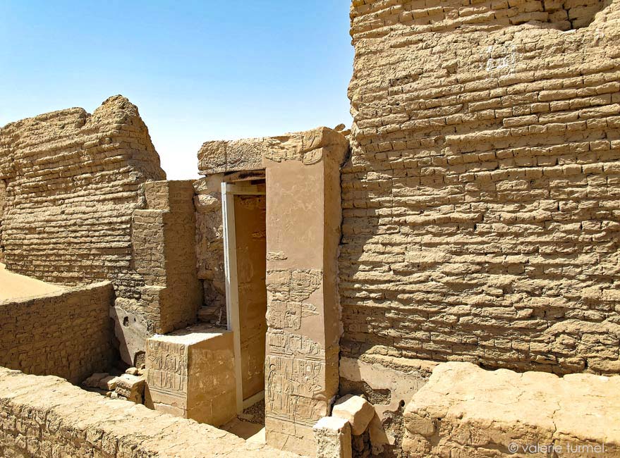Lea porte est protégée par un petit muret en briques, protection sans doute contre le sable. Il lui reste quelques vestiges de scènes sur les montants, décorés sous l'empereur Domitien (81-96).La porte se trouve dans l'axe du temple