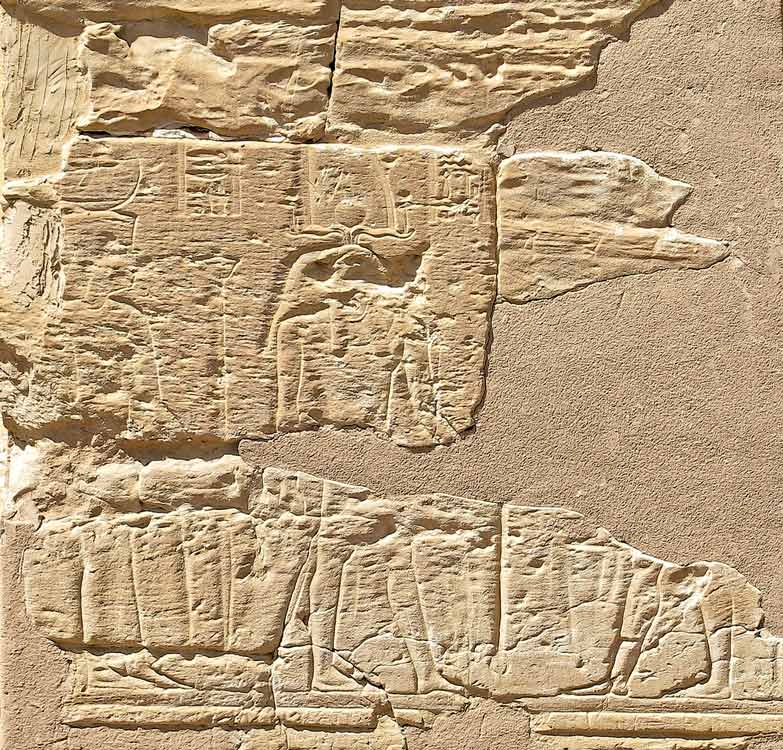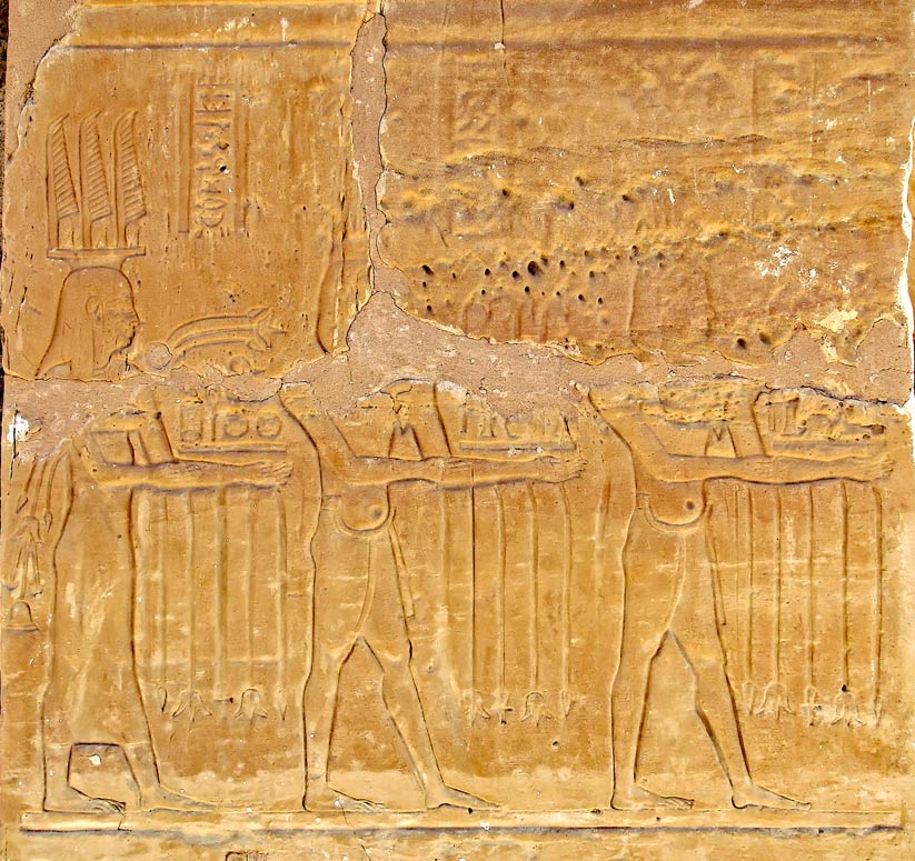 La seule scène restant sur la partie intérieure de la porte consiste en cette scène du bas du montant de gauche représentant une partie d'une procession de dieux Nil et de déesses Campagne. portant des produits venant sans doute de l'oasis de Dakhla.