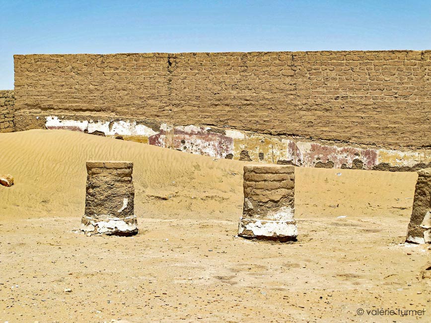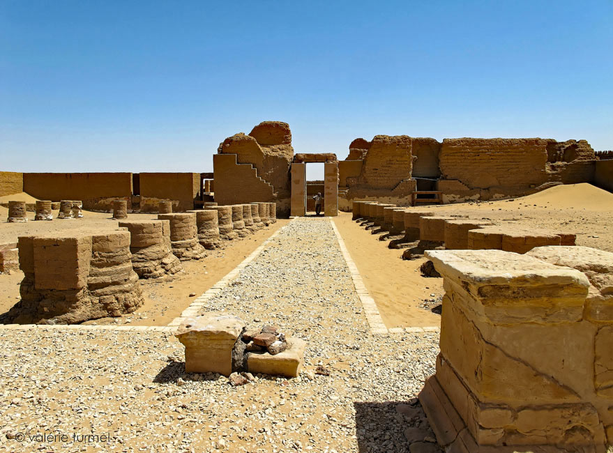 Une allée processionnelle mène de la porte d'entrée de l'enceinte à l'entrée du temple. Devannt le temple, ces deux socles devaient supporter des statues des empereurs.