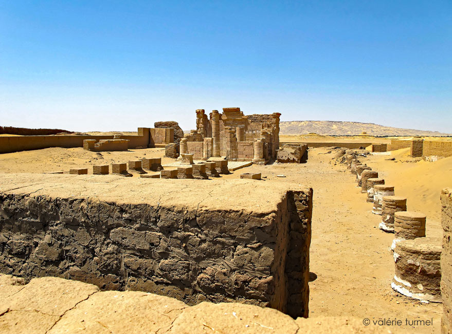 Prise depuis la porte, cette vue montre le temple entouré de l'enceinte. Des rangées de colonnes; réduites à leurs bases devaient soutenir des toits. La restitution de J.C. Golvin permet de visualiser l'état initial du temple. À gauche, un pan de mur soutient les vestiges du plafond astronomique du sanctuaire.