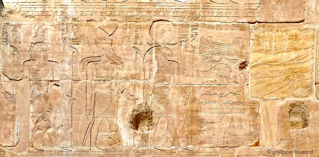 Darius (personnage disparu) présente une offrande très diversifiée à Rê à tête de bélier,