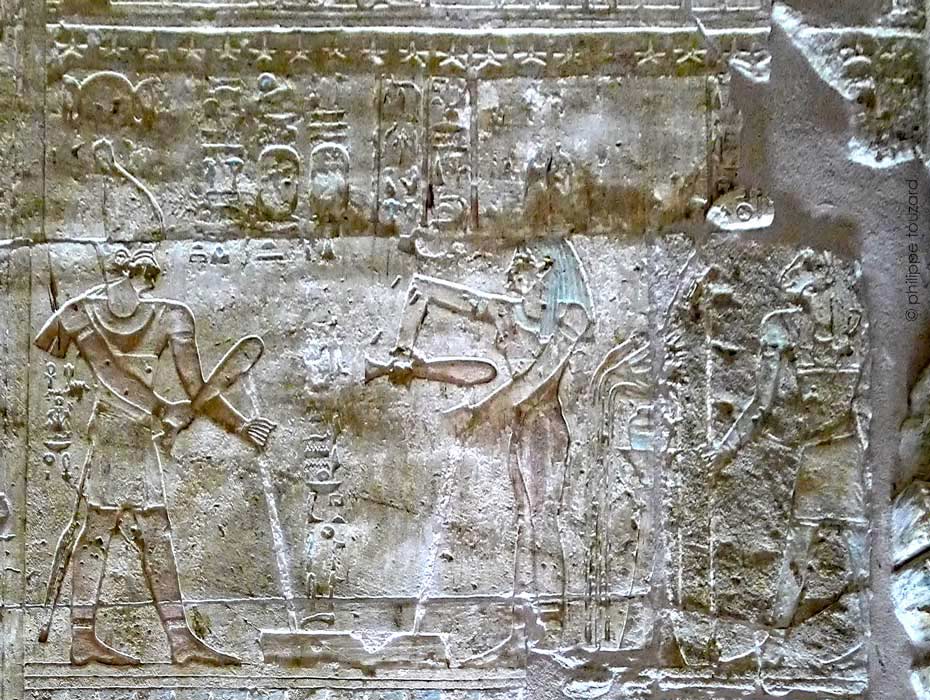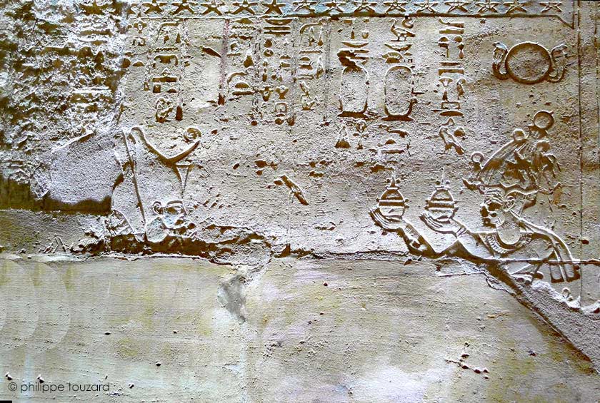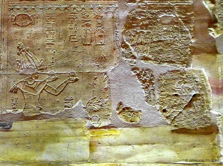 Le grand bloc manquant au dessus de la tête du roi laisse entrevoir la paroi de dessous qui a été masquée par la paroi actuelle. La même scène y avait été gravée.