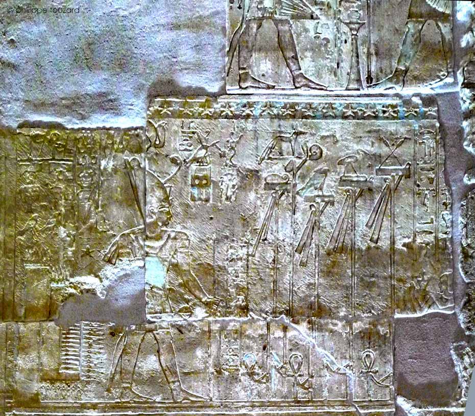 Les deux blocs manquants laissent apercevoir les restes de scènes de la paroi sur laquelle cette paroi a été placée.