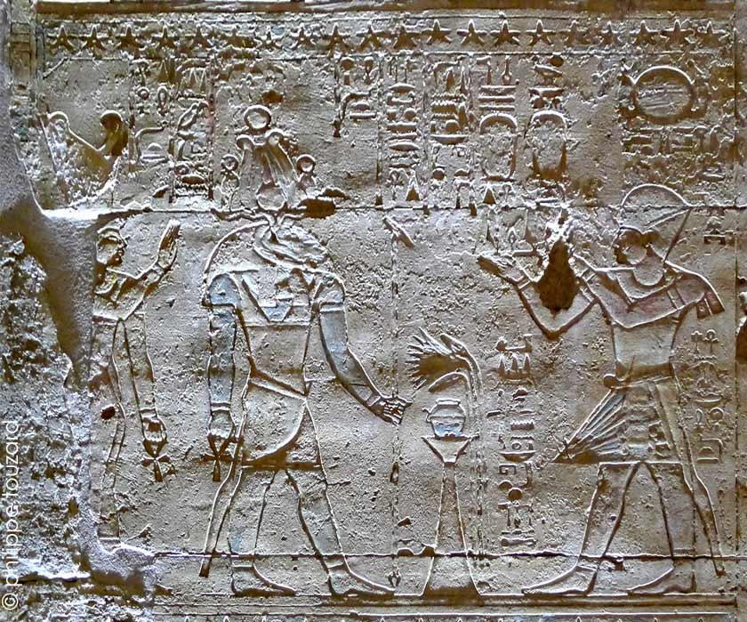 Le roi fait l'offrande du lait au dieu Atoum et à Neferhotep, 'l'apaisement parfait', dieu-enfant du VIIe nome de Haute Égypte, nom écrit avec le signe de l'or.