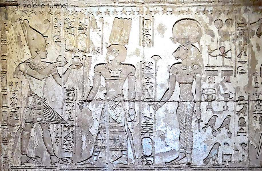À gauche, Sekhmet tend son tour de cou au roi.