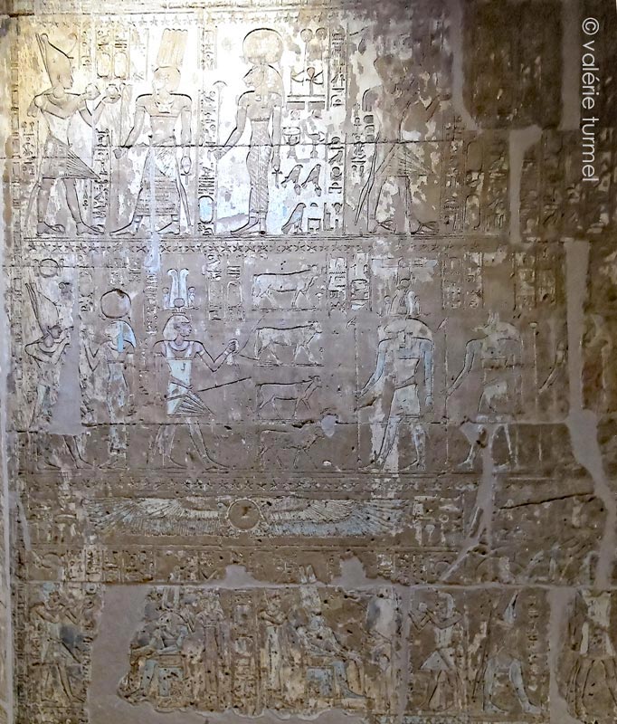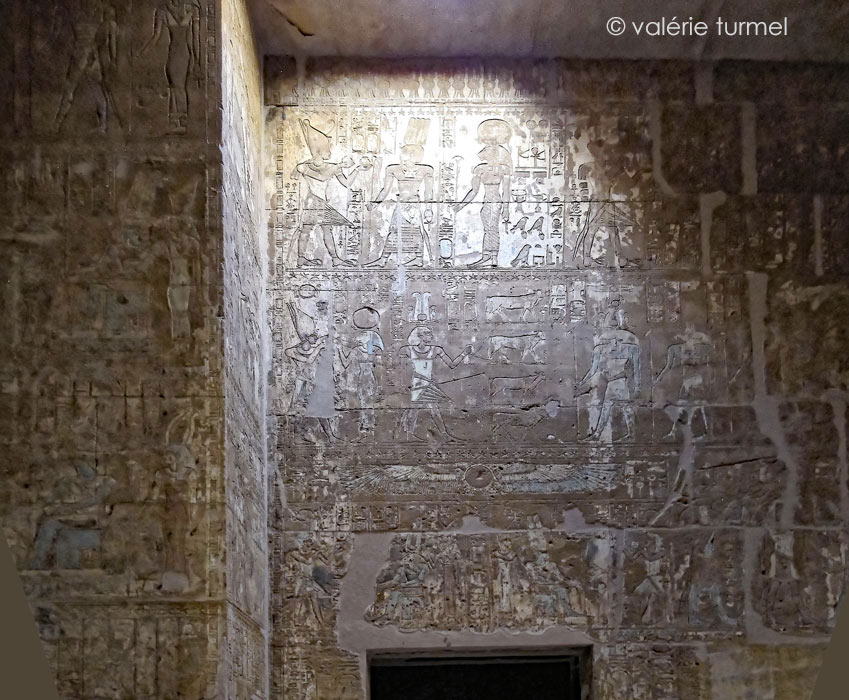 À droite, Darius conduit les 4 veaux vers Amon d'Hibis à tête de bélier, Oupouaout et Hathor.