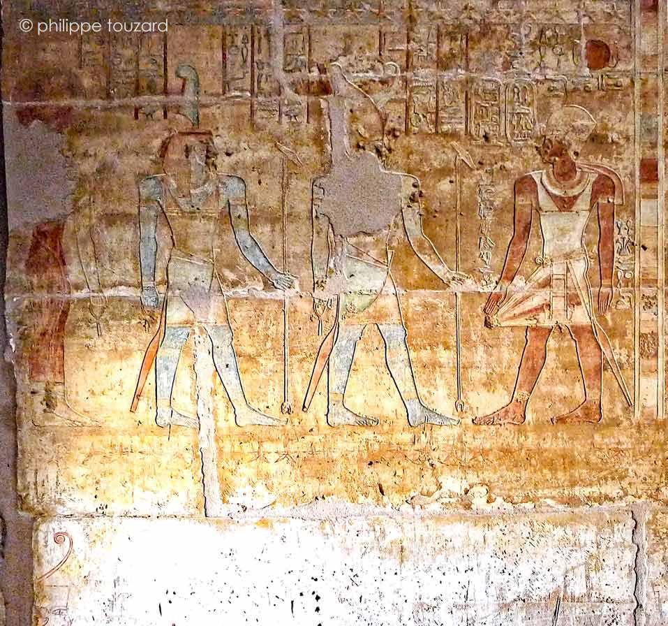 Le roi Darius à droite adore Atoum, Chou et Tefnout. (Davies, part II, planche 35 et p.26)
