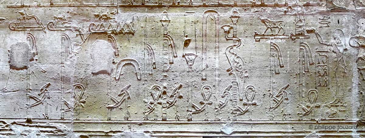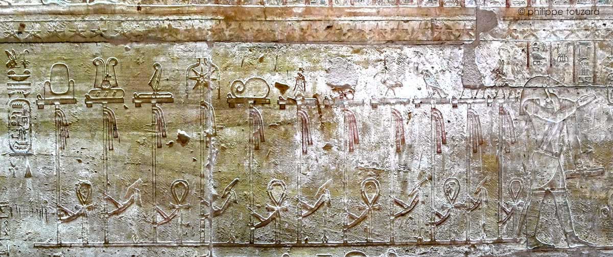Une série d'enseignes tournées vers le roi précédent la barque. Elles sont tenues par des signes ankh et ouas figurés avec des bras humains. La liste des 21 enseignes est donnée par Davies.(p.25 et 26).