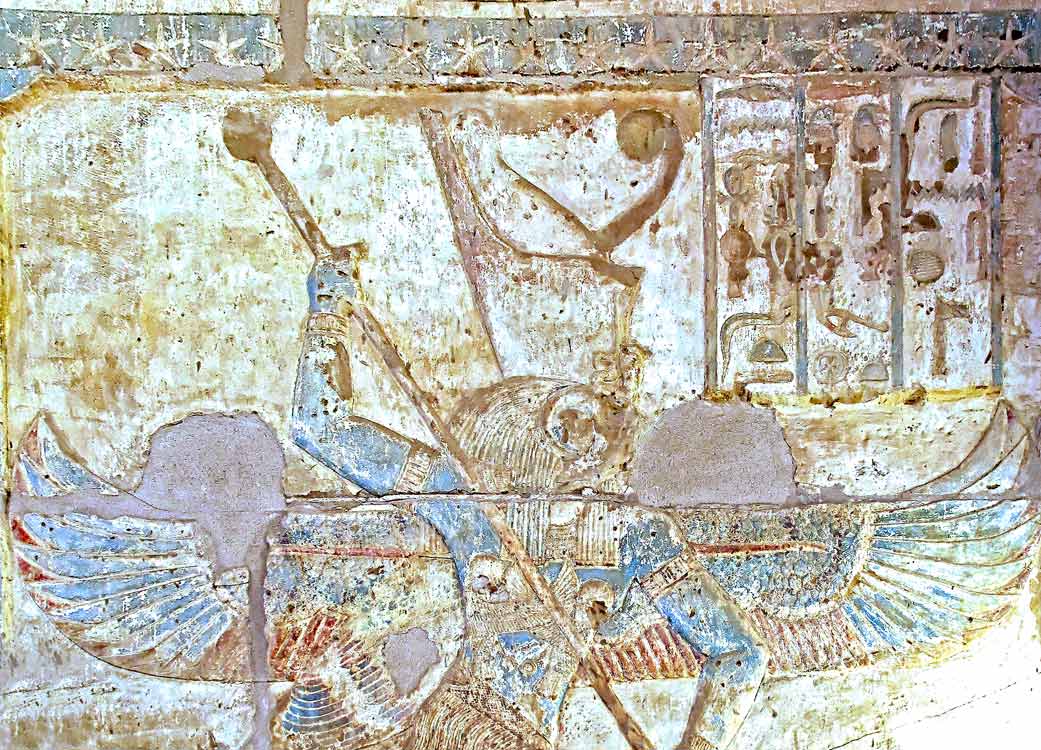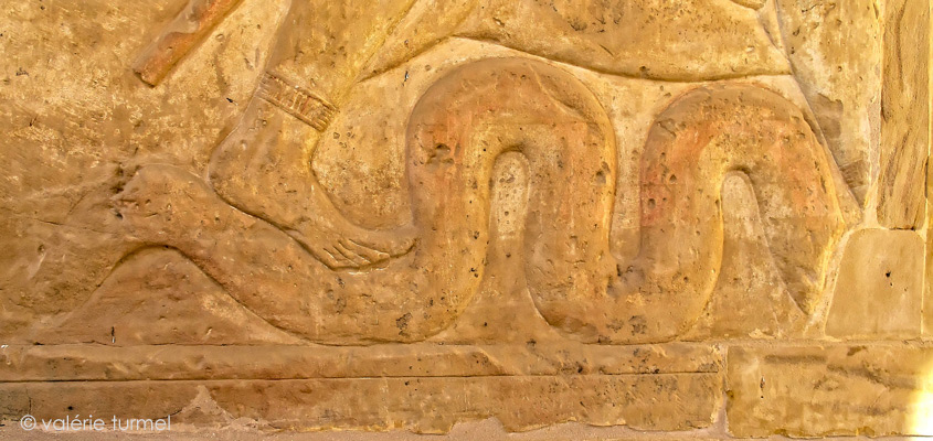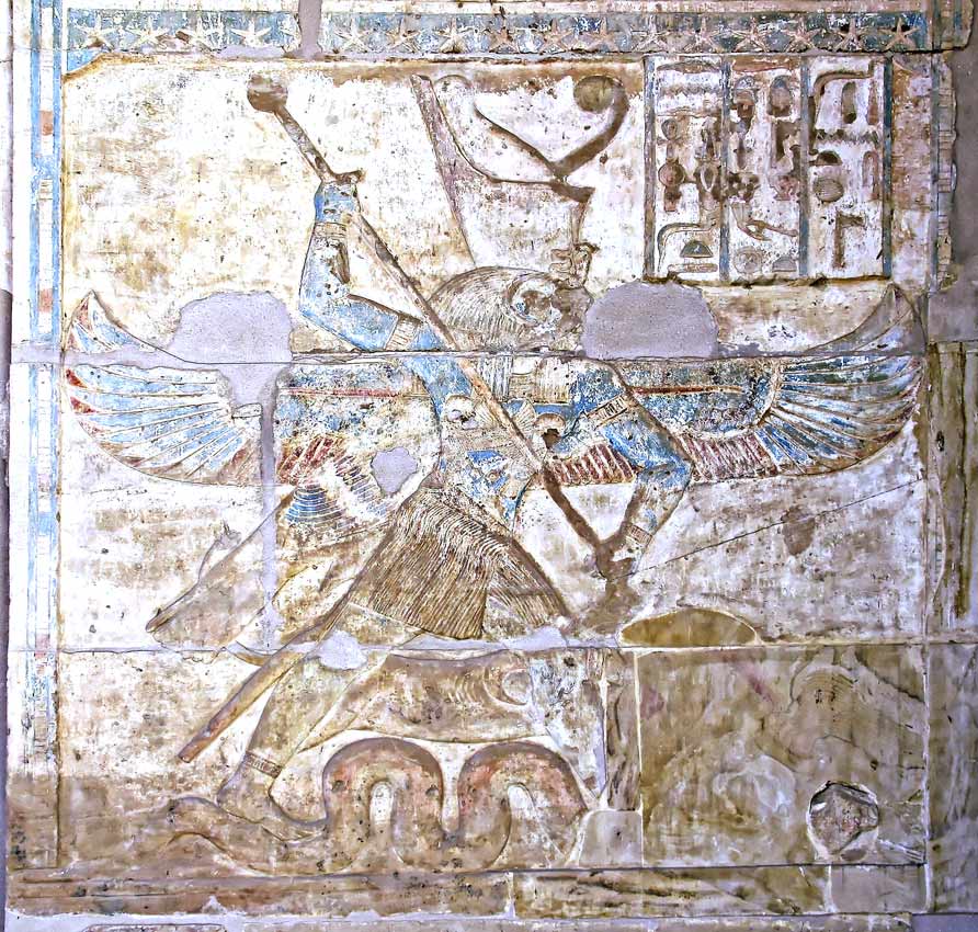 Le serpent Âpopis, serpent gigantesque, incarne les forces du chaos. ( en égyptien Âapep). Incréé, il ne peut être détruit, mais seulement neutralisé pour un temps. Toutes les nuits, l'incessant combat entre l'astre solaire et le serpent reprend jusqu'à ce que la lumière triomphe. Rê a chargé Seth de défendre sa barque, car il est le seul à ne pas être hypnotisé par le serpent. Armé de sa lance, ill transperce la serpent. (Corteggiani, ...et ses dieux, p.48)