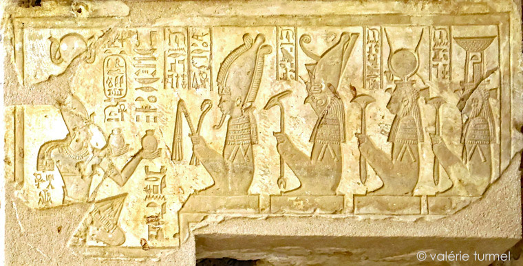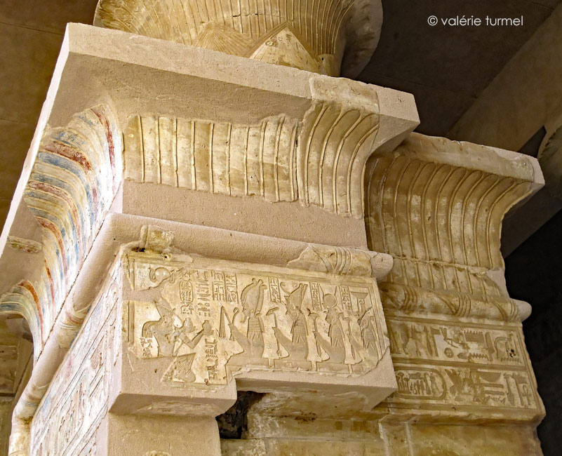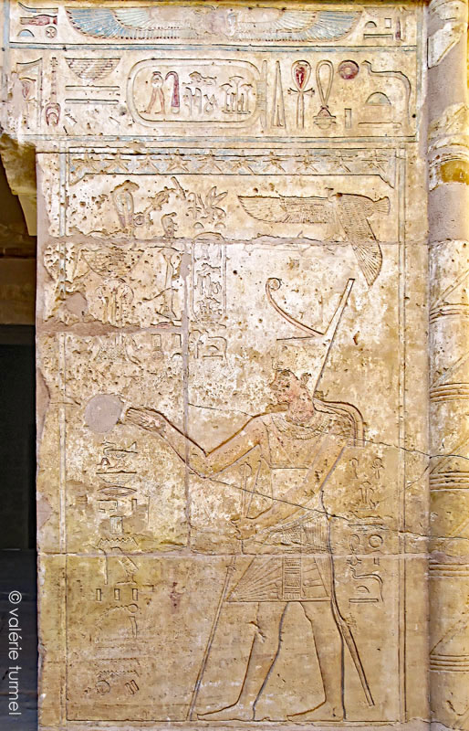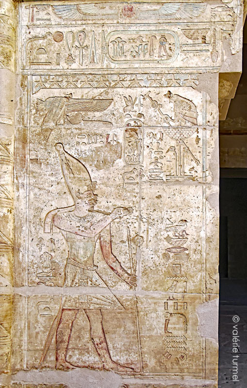 Des restes de couleur subsistent sur les scènes de la paroi Ouest, scènes toutes gravées dans le creux comme les montants extérieurs ici.