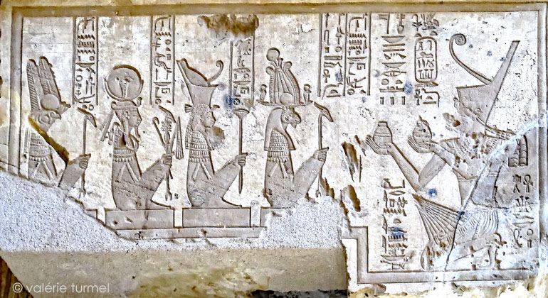 Darius agenouillé offre 2 vases de vin à Osiris, Horus dils d'Isis, Isis et Nephtys.