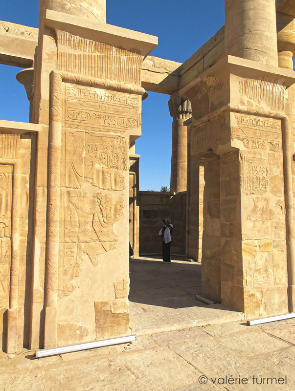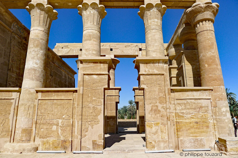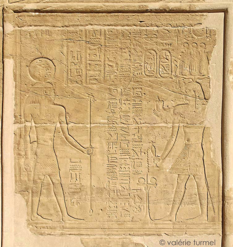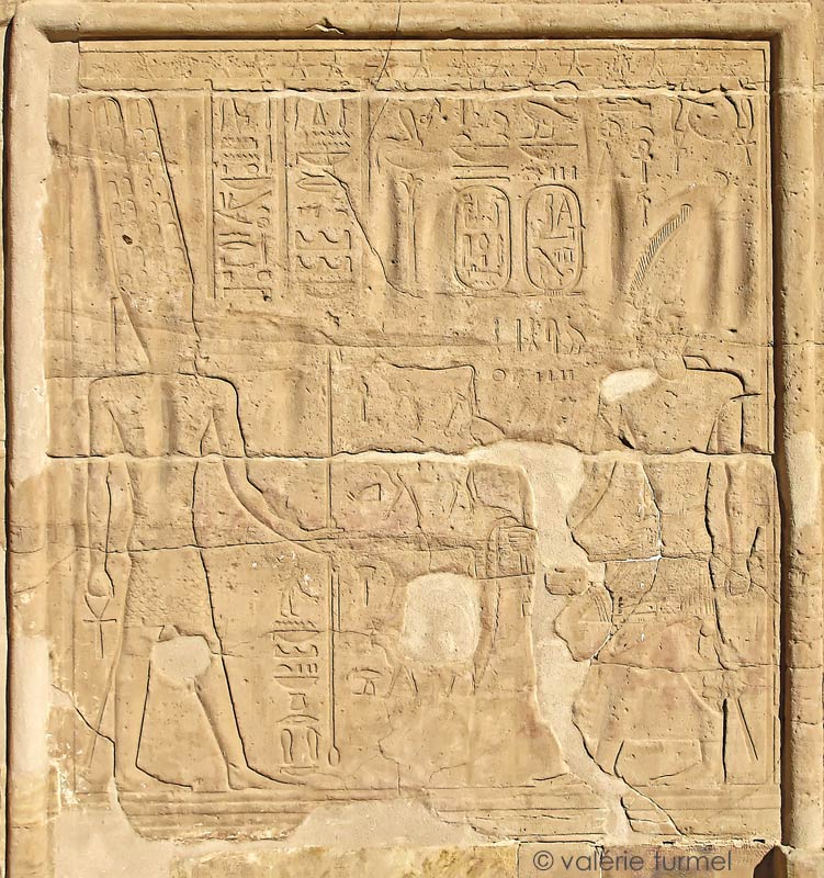 Sur le montant Est, de même Behedety ailé est sur le linteau brisé. En dessous, le roi (disparu) porte le couronne blanche. Nekhbet veille.