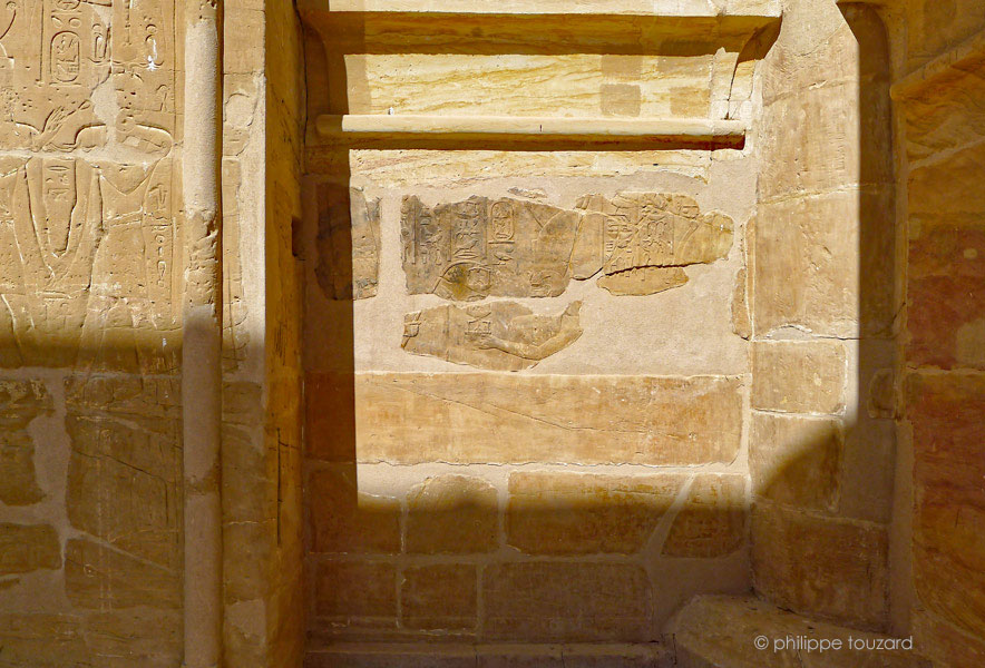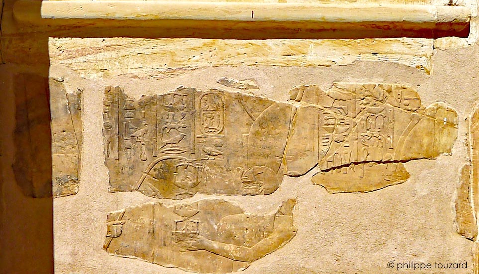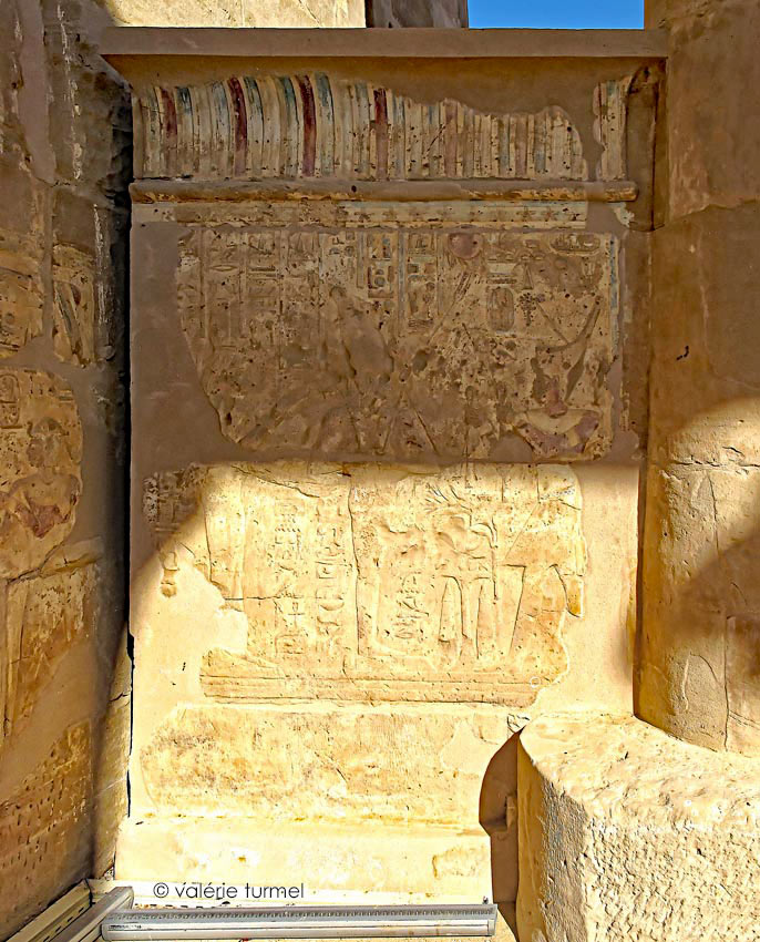 Du côté Ouest de la porte, sont situés deux murs-bahut avec des scènes d'offrandes et du côté Est, côté de la façade, un mur-bahut présentant une scène fragmentaire. Se voient