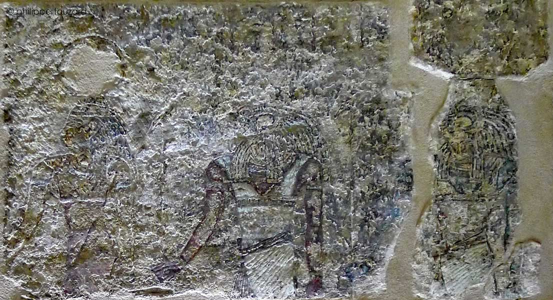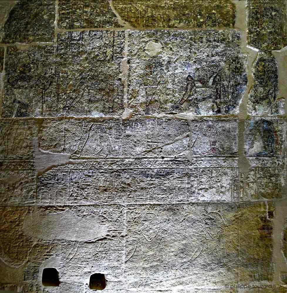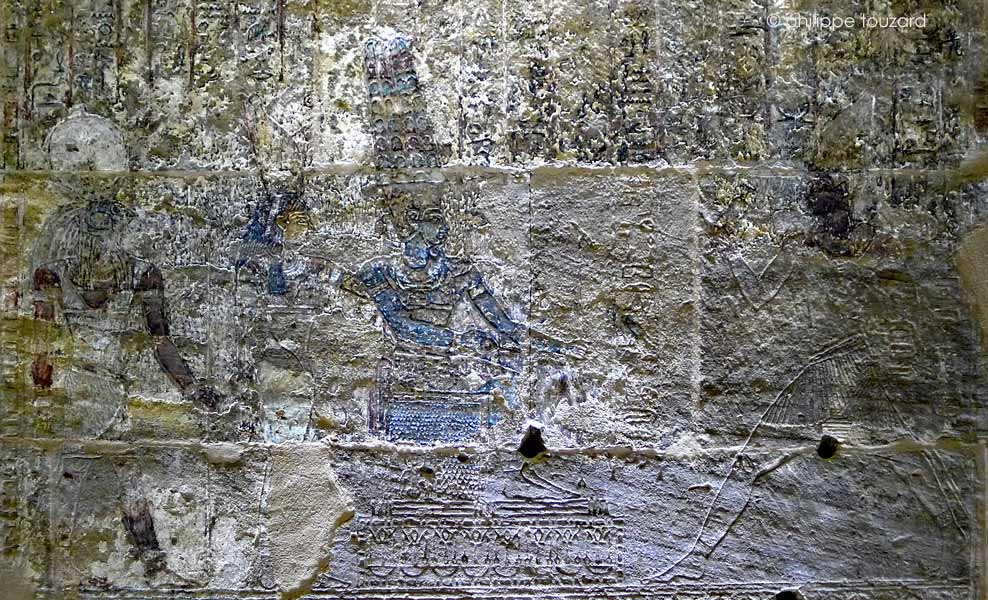 Le roi offre des tissus au dieu Geb, "prince des dieux, seigneur de toutes les places, que son Ka aime"; Nout, ; le dieu Merymoutef, ici à tête de faucon (dieu bélier de la région d'Assiout) et Horus, le premier né, fils de Nout.