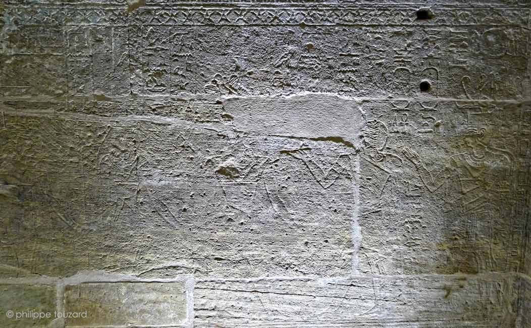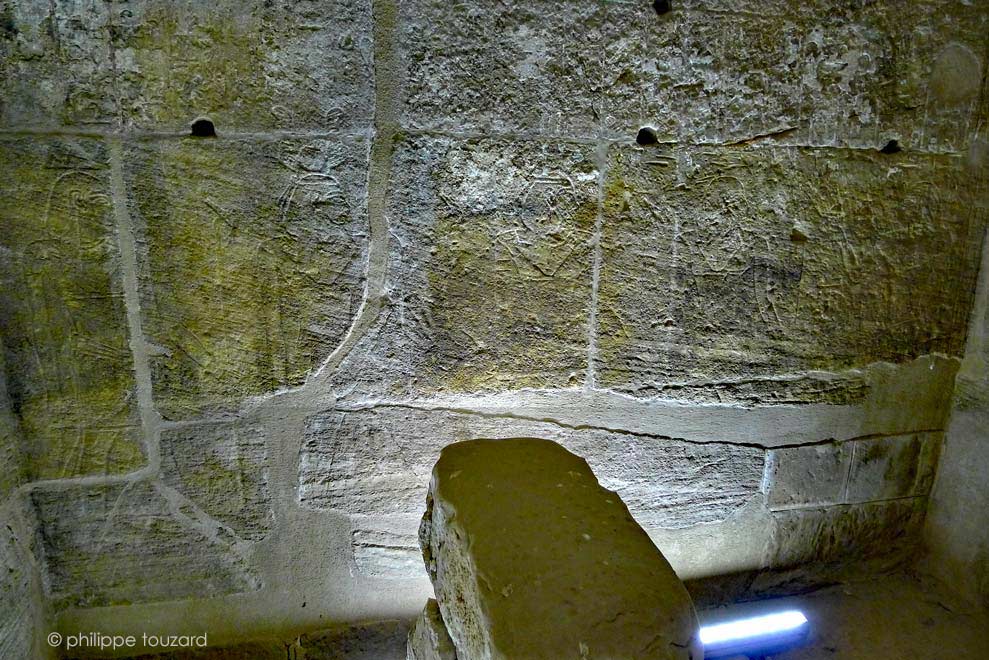 Les décorations de cette salle sont peu profondément creusées et beaucoup de couleurs subsistent. Les parois fortement dégradées ne permettent pas une claire visibilité des scènes.