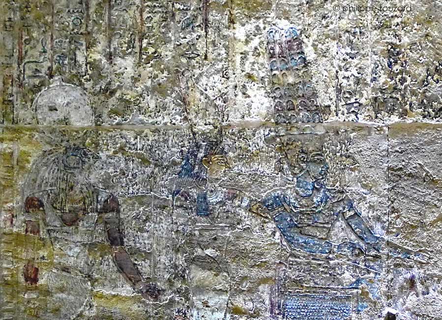 Le roi et le prêtre Iounmoutef consacrent des offrandes pour Osiris, Isis "sœur d'Osiris" et Nephtys.