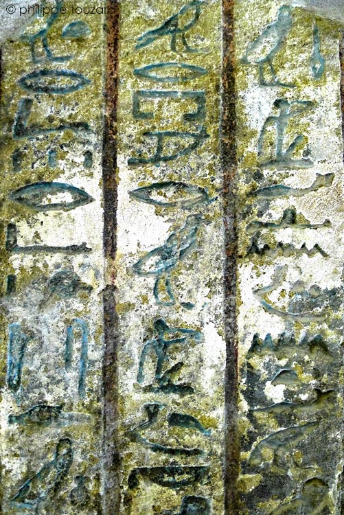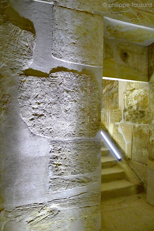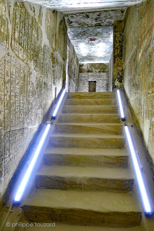 Sur la paroi Sud de l'escalier, Thot, à la chevelure bleue présente un hymne au dieu Soleil en 25 colonnes. De l'autre côté, sur la paroi Nord, Horus 'détruit) présente un hymne à Osiris. Les hiéroglyphes