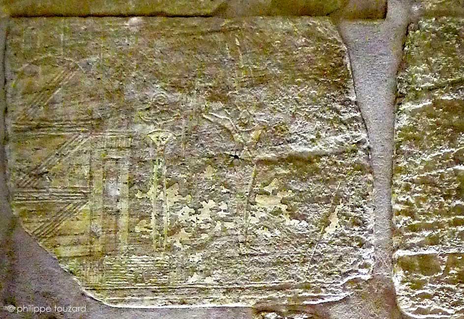 Sur la même planche 22, ce fragment de scène montre le dieu Min ithyphallique suivi d'une représentation de sa chapelle primordiale. Cette chapelle est toujours précédée d'un curieux mat avec des cornes et ici portant une figure hathorique regardant de face