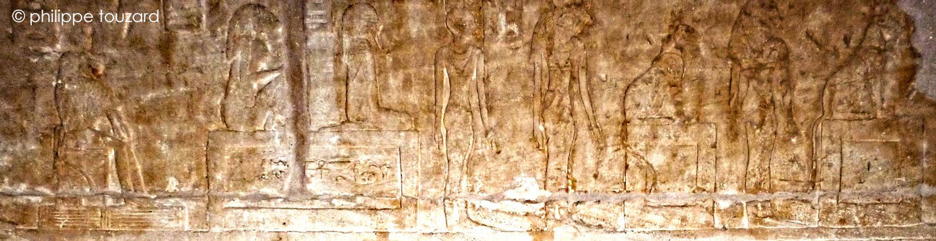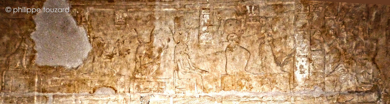 Le 3e registre est bien lisible . Au début du 3e registre, à droite, Darius offre un pain blanc à la Grande Énnéade. En 2e positin, Oudjet coiffée de la couronne rouge est agenouillée sur un piedestal. Ensuite, en 3, le dieu Thot, puis un serpent à tête de bélier portant la double couronne (4). Une autre dieu Thot à tête d'ibis (5). Pour la suite, voir ci-dessous. Á gauche, la grande partie manquante n'existe pas dans le relevé de Davies. Les nombres renvoient à Davies (part III, planche 3 et p.6)