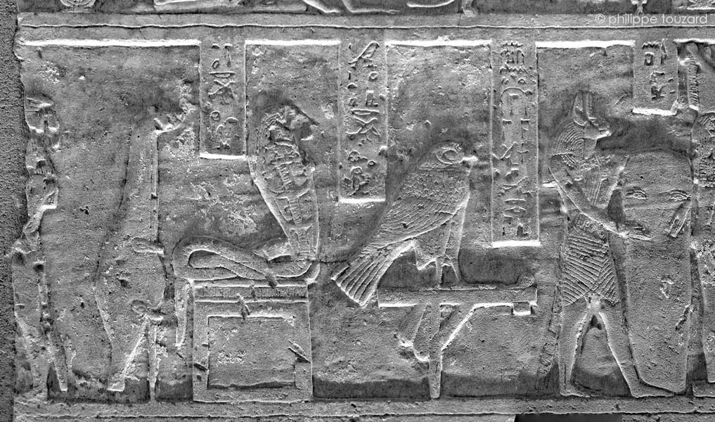 Anubis (15) tient une stèle ronde. Le faucon Horus, fils d'Isis se tient sur un perchoir (16). Un cobra à tête de lion est dressé sur un autel devant Ouadjet (17). En 18, un symbole et en 19 une représentation à moitié détruite.