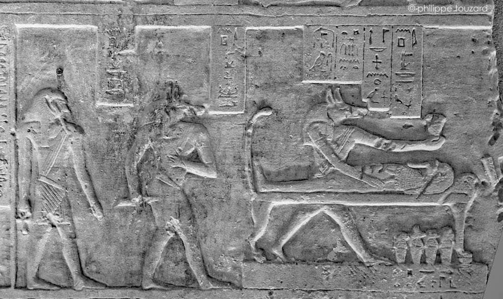 À droite, Anubis étend de l'onguent sur la momie d'Osiris couchée, avec les 4 vases canopes contenant les viscères (20). Suit encore Anubis en train de danser (21) et encore un Anubis en 22.