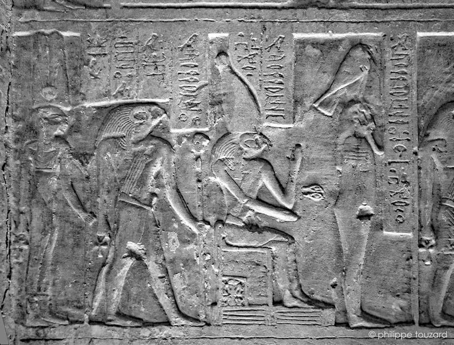 Un dieu momofié avec un faucon sur la tête (23) représente Hormerty, dieu faucon de Chedenou, métropole du XIe nome de Basse Égypte. Ce même dieu est également représenté à la suite, assis sur un trône et portant la couronne blanche (24) Encore Hormertry en 25 suivi d'une déesse portant 2 grandes plumes en dernier (26)..