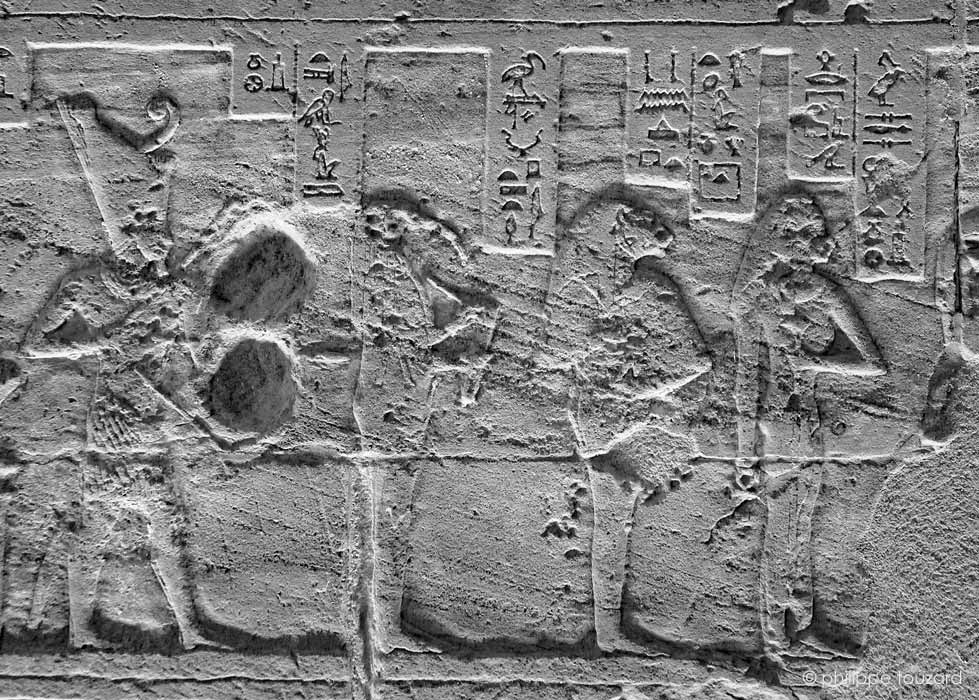 Darius présente une image de Maât. Les 2 premières divinités montres sur cette vue sont fragmentaires : D'abord Nebethetep (Iousâas) porte le signe d'Hathor sur la tête (5). Ensuite Bastet avec une tête de chatte (6). Puis encore Iousâas avec un sceptre en forme de papyrus (7).