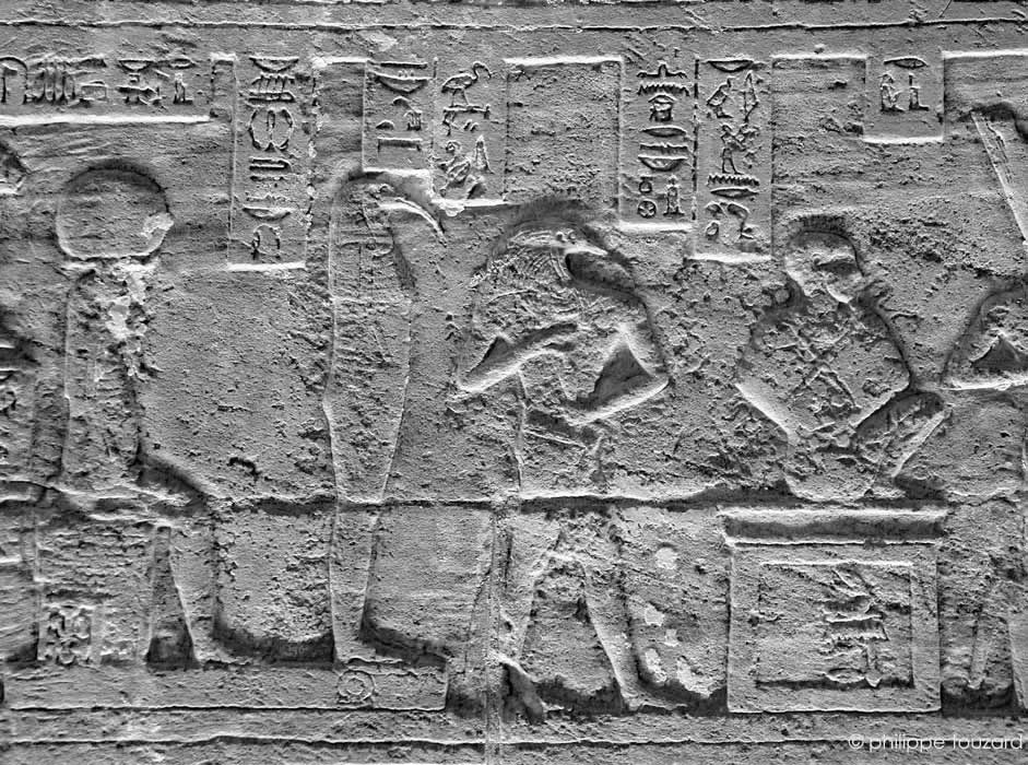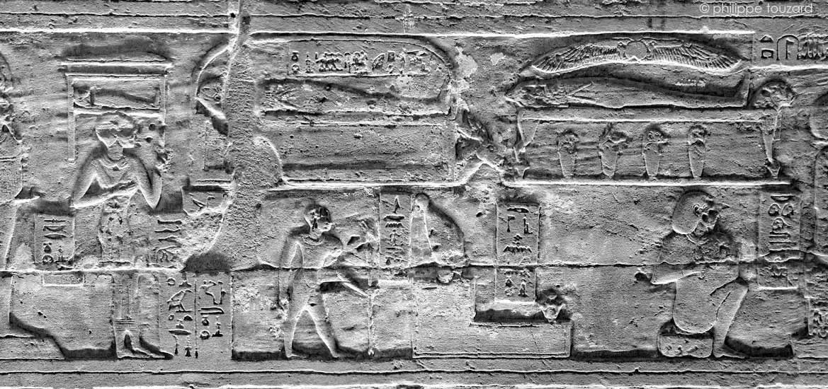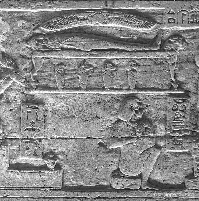 Sur le piédestal Osiris en bandelettes (11). Le dieu à tête d'ibis qui suit (12) est sans doute Thot portant des vases. Le même dieu est représenté ensuite (13) momifié sur une plateforme. Ensuite un dieu assis sur un trône portant un disque sur la tête (14).
