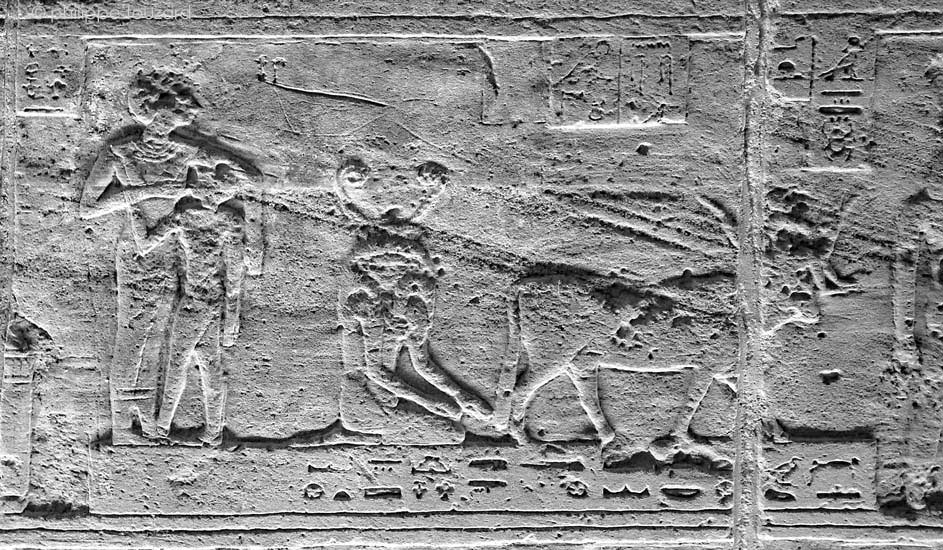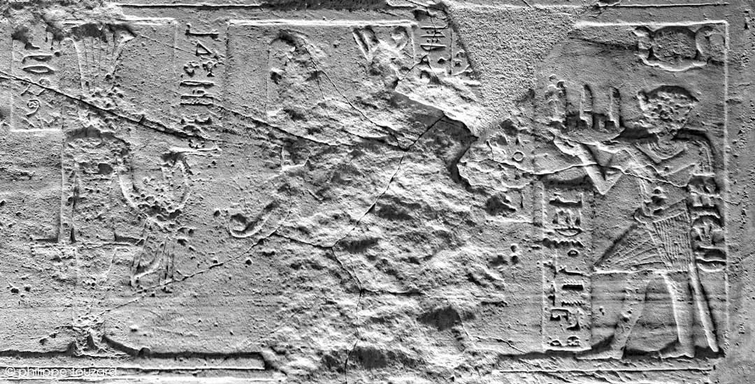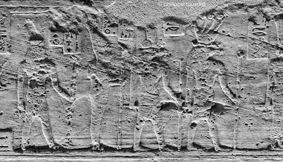 Darius présente le signe de la campagne à Amonhibis. Suit un dieu dont l'image est pratiquement manquante et qui porte la Double Couronne : Sobek-Rê (?) se tenant peut-être sur un lion (2). Vient ensuite en 3 un symbole portant 2 grandes plumes (dégradé). Puis une représentation de la déesse Anouqis du Fayoum portant un arc et des flèches (4) avec sa coiffure caractéristique. |